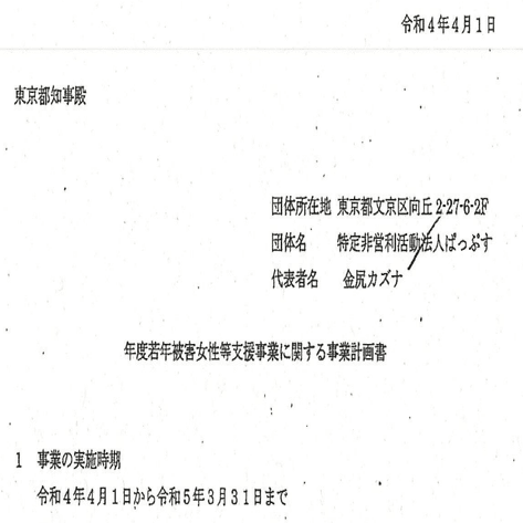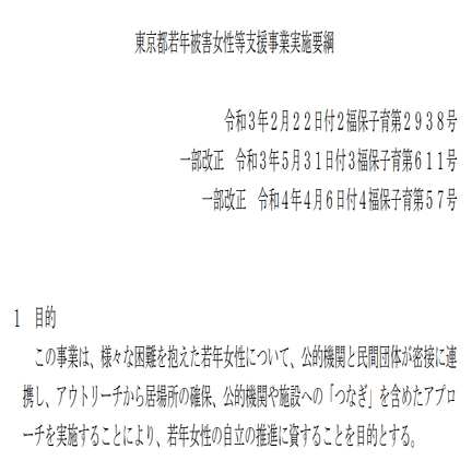 な「えー、この事業は、様々な困難を抱えた若年女性について、公的機関と民間団体が密接に連携し、アウトリーチから居場所の確保、公的機関や施設への「つなぎ」を含めたアプローチを実施することにより、若年女性の自立の推進に資することを目的とする。あれっ?」