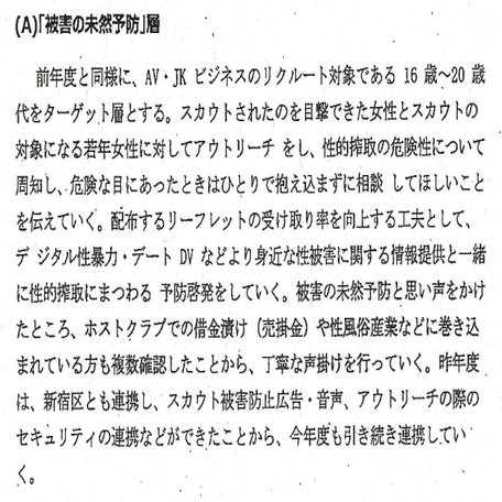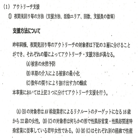 な「(A)(B)の対象者はAV斡旋業者によるリクルートのターゲットになる16歳から22歳の女性。(B)(C)の対象者は何らかの形で性風俗営業、性風俗関連特殊営業に従事している若年女性である。(A)(B)(C)はそれぞれ別の経緯で性産業に関わり、あるいは巻き込まれていくために、支援の方法も異なる。・・・・・・ハァン?」