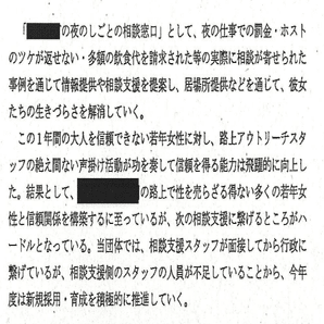 な「えー、「結果として、▓▓▓▓▓の路上で性を売らざる得ない多くの若年女性と信頼関係を構築するに至っているが、次の相談支援につなげるところがハードルになっている」