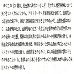 な「特にこの(C)層は、正売買の渦中にいるほど、受けた人権侵害性について気づきにくくなることから、アウトリーチ・居場所拠点を通じて、長期的かつ継続的な見守り、福祉や行政機関につながるまでのあいだ、面接を重ねながら、生活管理の仕方、金銭管理の仕方、食生活の改善方法など日常生活スキルの獲得への支援、福祉の制度利用に抵抗のある方への情報提供を行う。金銭感覚が失われた相談者の場合は、時間を欠けながら生活水準にあったライフスタイルの提案を行う。金銭感覚そのものは、本人の価値意識に関わるものであることから、相談者の自尊心を傷つけないよう注意しながら異なる生活スタイルの提案を行う。ふむん?」