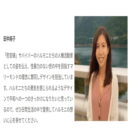 「慰安婦」サバイバーのハルモニたちの人権活動家としての姿を伝え、性暴力のない世の中を目指すマリーモンドの理念に賛同しデザインを担当しています。ハルモニたちの勇気を感じられるようなデザインで平和への一つのきっかけになりたいと思っているので、ぜひ日常生活の中で愛用してハルモニの想いに心を寄せてください。