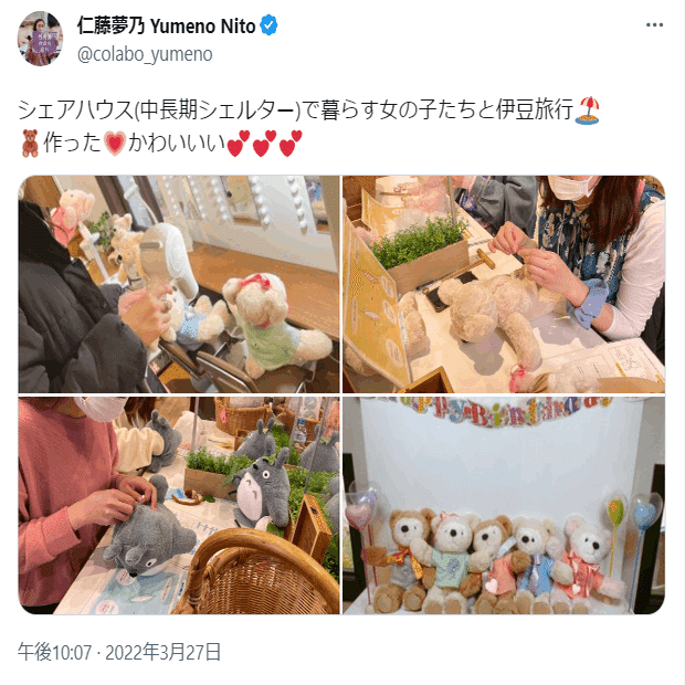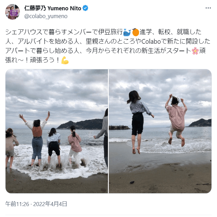 ひ「共産党と強いつながりがあるColabo代表仁藤夢乃さんは2022年の3月27日頃、シェアハウスで暮らす中長期保護の子たち、新生活に旅立ったり、Colaboのアパートで暮らし始める予定の子達と伊豆旅行にいったらしいんだ