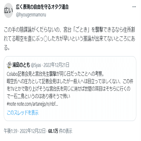 ひ「殺害とはレベルが違うって主張じゃない?あと、当然これは意見であって殺害をけしかけたものではないという予想されていた反論もあるね」