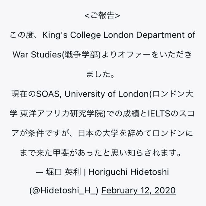 ひ「堀口くんはIELTSのスコアが条件でキングス・カレッジ・ロンドンへの入学オファーをもらったとツイートしてる」