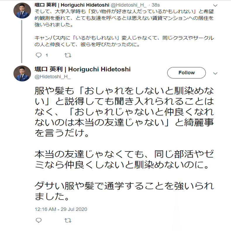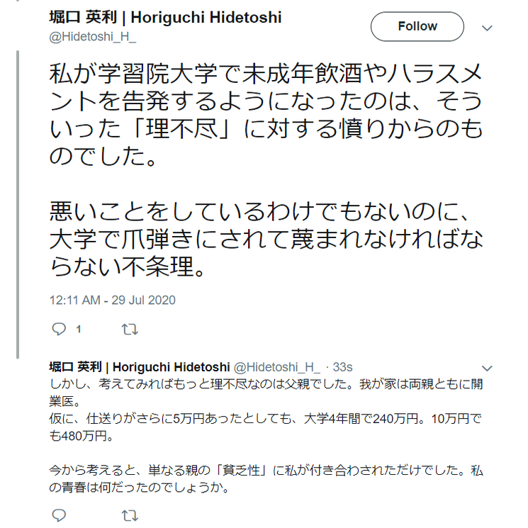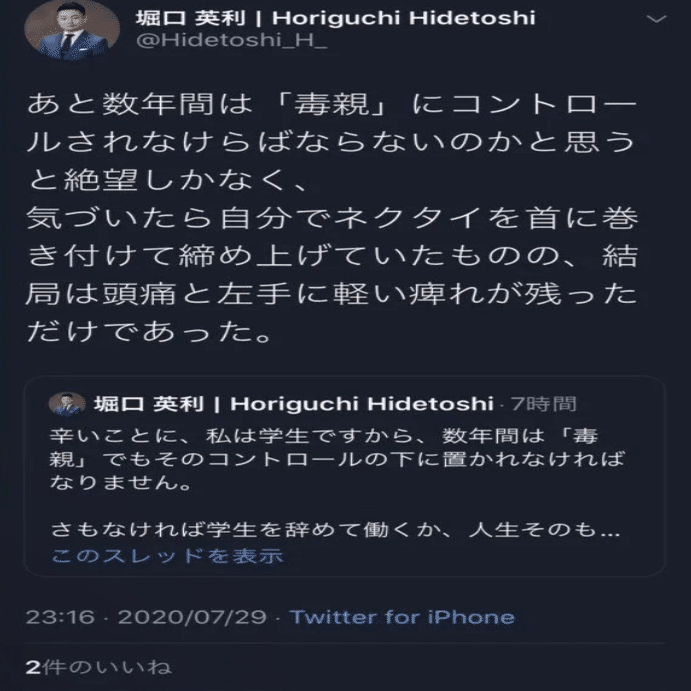 ひ「堀口くんがこれから数年「コントロール」されるか、「学生を辞めて働くか」を親から迫られたのが2020年7月29日なんだよ」