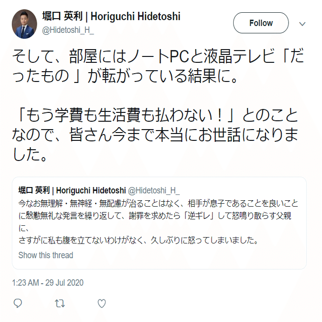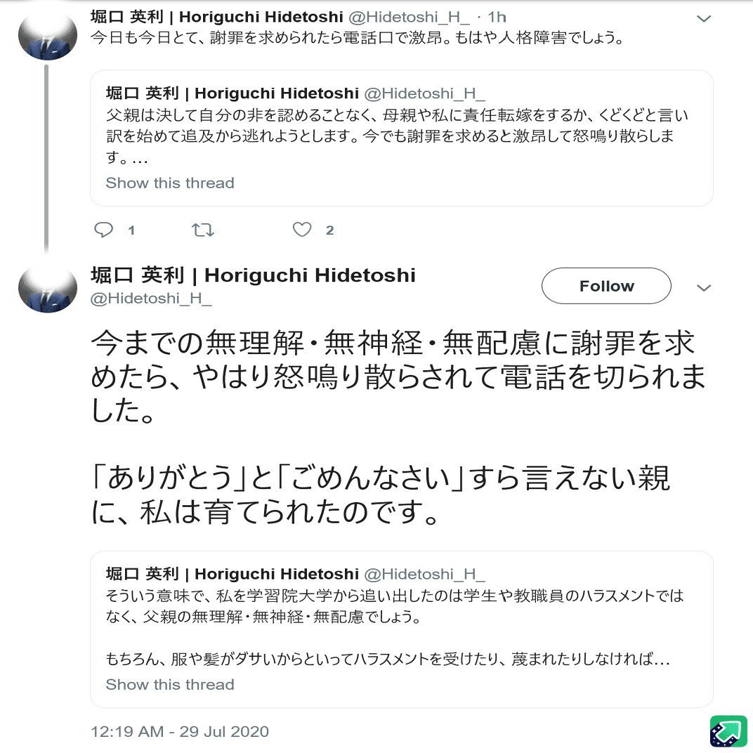 ひ「というわけで、堀口くんが異常に荒れて、PCやテレビを破壊し、父親に「今までの無理解・無神経・無配慮に謝罪を求めてきた」を求め、ネクタイを首に巻いてみたり飛び降りることを迷ったりした日が2020年7月29日という、IELTS試験でもしギリギリまで合格できなかった場合の最終結果発表日なんだよ」