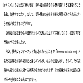 ひ「そしたら速攻で神原弁護士から「暇空茜の尋問は実施されなければならなあああああい!!!!」ってこの意見書に対する反論とかを入れた書面9が出てきたよ。なんとあの神原弁護士が、Manner Maketh Man=堀口と言える根拠がない!!堀口は加害者ではなく被害者!!よって危険があるとは失当!!とか主張してるよ。モニターにナイフ突き刺すのは加害者以外の何物でもないとおもうけどねえ」