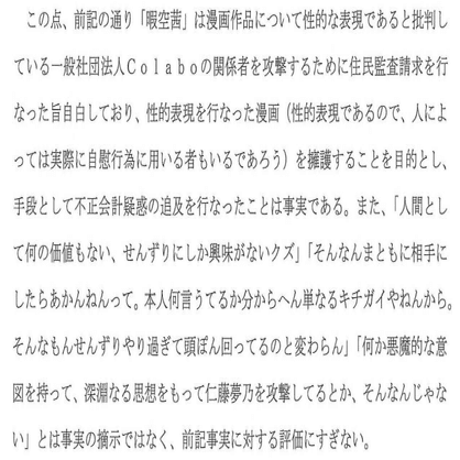 ひ「「暇空は性的表現漫画(性的であるから自慰に用いる人もいるであろう)を擁護することを目的とし不正会計疑惑を追及したのが事実である。以下の口にするのも汚いような罵倒の数々は、それに対する評価にすぎない」