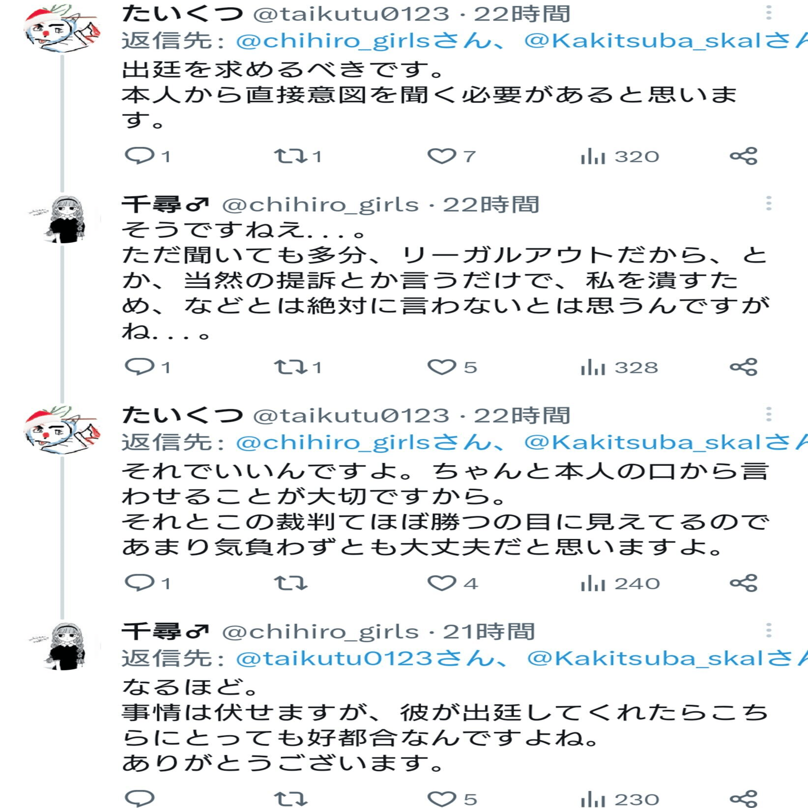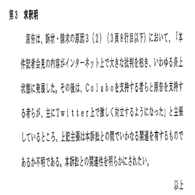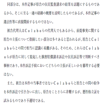 ひ「こういう裁判外のお気持ちをブリバリ言っても裁判官も気にしないことがほとんどなんだけど、たとえば”当たり”の左翼系裁判官を引いてたら意味があるかもしれないし、もしColaboと関係ない裁判で有利な認定でも取れたら儲けもん!って感じで主張してるように見えるね」