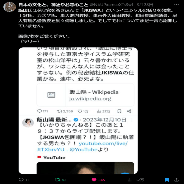 誤解だったとしても飯山さんがJKISWAなどとキャッチーな呼称をつけたことにより、一部の過激な百田&飯山ファンが彼らをネット攻撃したのは事実です。
