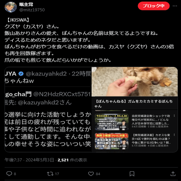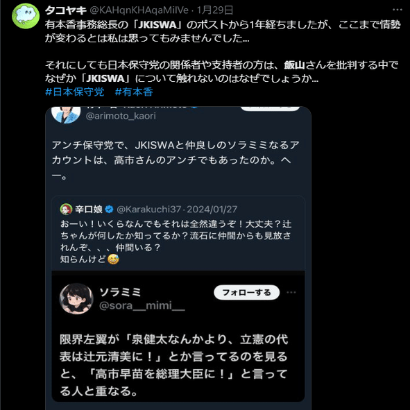 もちろん、これだけなのですが、何度もKAZUYA氏はこの出来事にふれていますが、やはり「秘密結社など事実無根である」「なぜこんなことを言われたかわからない」と同時に、今の日本保守党と飯山氏の件についてのみいうならば、彼は日本保守党の在り様は問題視しています。もちろん飯山氏を支持するという言い方はしませんが、あくまでのこの守る会が目指している趣旨については、おおきく外れずに認識していると思われます。