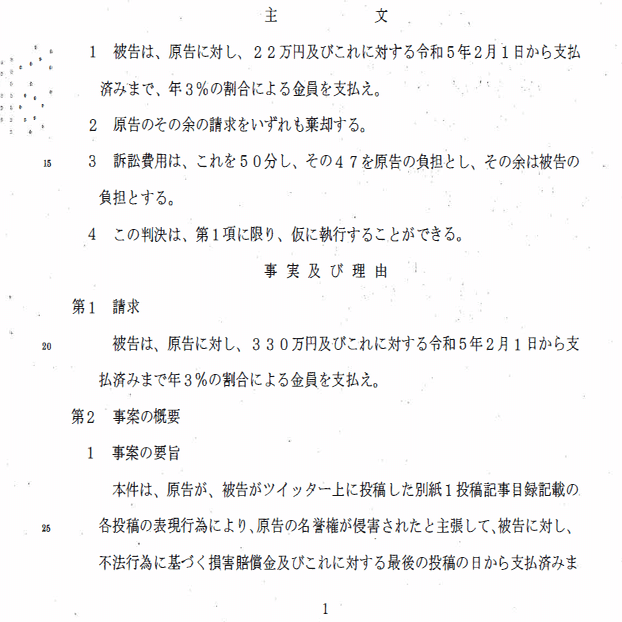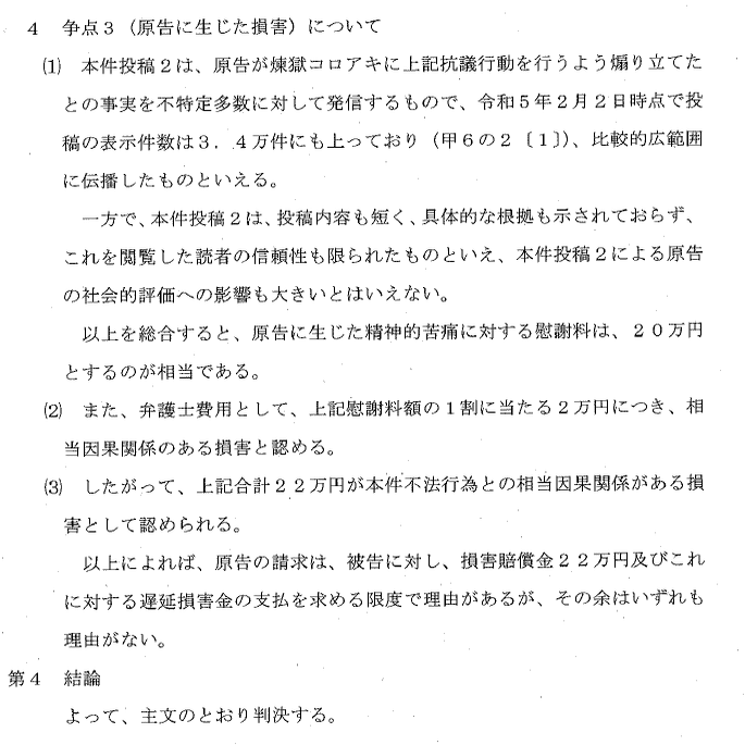 ひ「で、最後にインプレッション3.4万件で、名誉毀損は認めるけど内容は短文で具体性にかけていて、まあ20万円ねって金額の算定理由が書いてある」