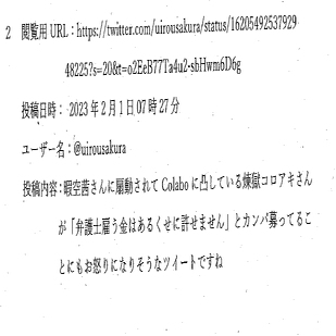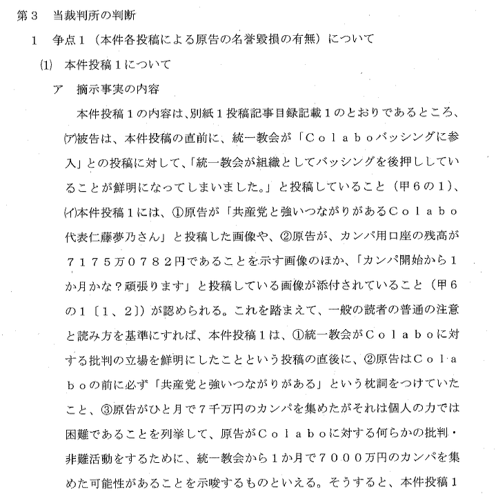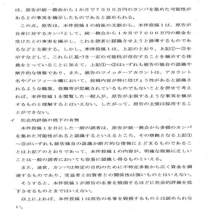 ひ「裁判所としては「このツイートは、暇空が統一教会から1ヶ月で7000万円のカンパを集めた可能性がある」との事実を摘示しているものと認める。しかし、桜ういろうはツイッターアカウントにのアカウント名やプロフィールに、特に信憑性があると認識させるような職業や役職等が記載されていないから、「可能性がある」にとどまるのである」