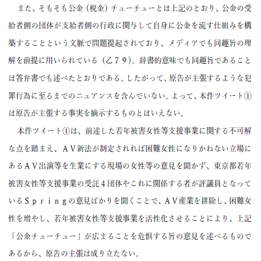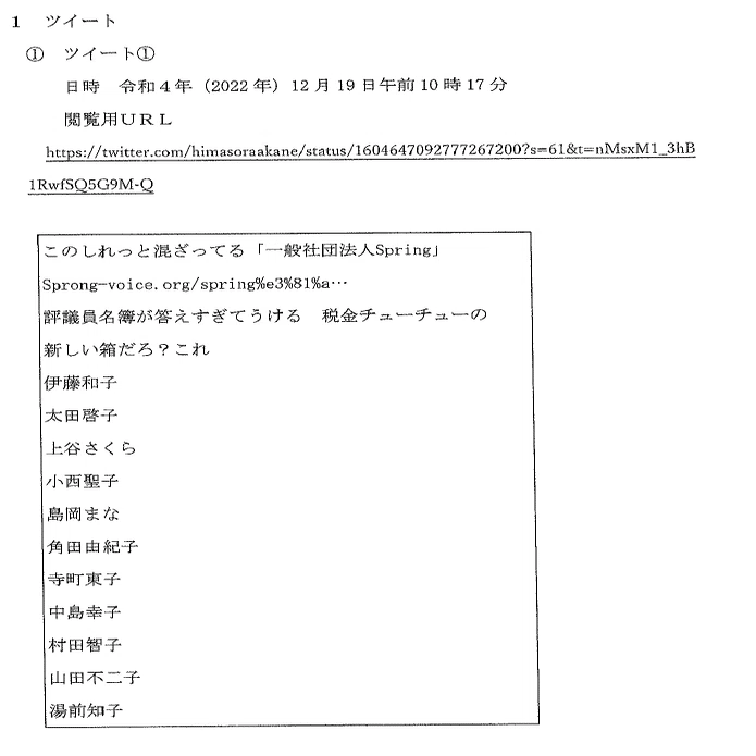 ひ「こういうのだね。ナニカグループとか公金チューチュー(当時は税金チューチュー)としてSpringの名簿を出したりしたのが伊藤和子の名誉毀損になる!って訴えてきたっていう」