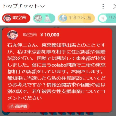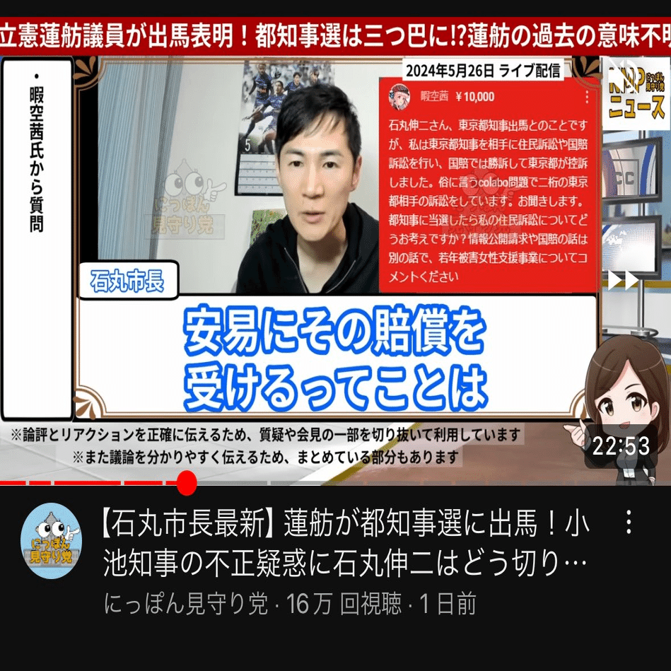 ひ「前回の動画でスパチャなげたライブの話をしたんだけど、例の2023年8月以降に雨後の筍のように乱立した石丸系チャンネルでも、当然ネタとして扱われてたんだ」