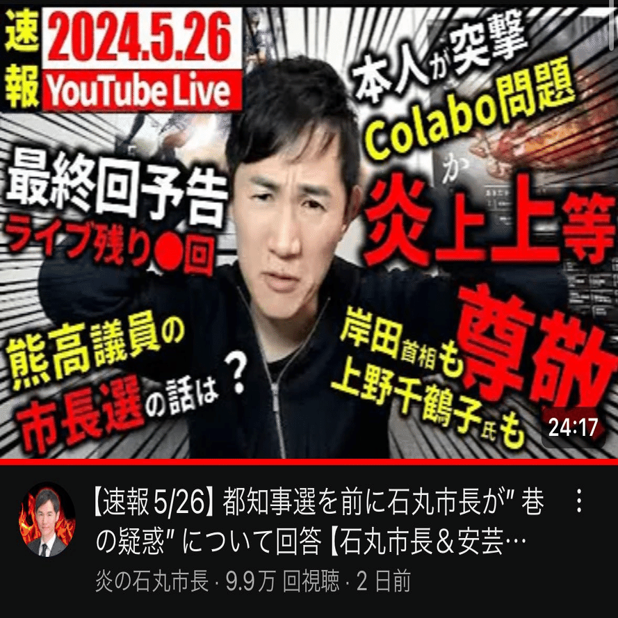 ひ「だったら、一応石丸伸二本人もご本人ですか?とか反応した僕の名前出したほうが再生数回るから普通サムネとかでもいれるじゃん?」