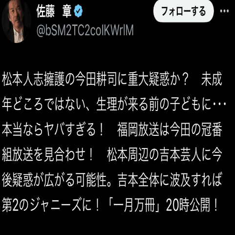ひ「ジャニーズ潰し活動に邁進して、松本人志潰しとかもやりたい感じで、望月衣塑子さんらとつながりが強そうな記者だって」