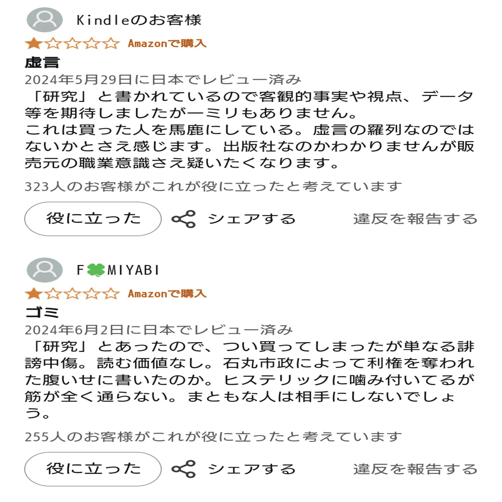ひ「なぜか石丸伸二の本に星5、告発本に星1とかつける、工作員にしか見えない人たちが、6/2に大量に湧いてる。ほとんどの人が購入してないのにレビューつけてておたがいに参考になったを押し合ってるかんじだね」