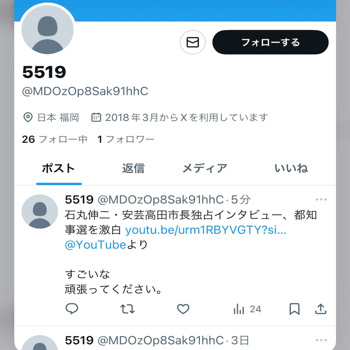 ひ「こういう、ランダムにツイートとかRTしてるだけのbot丸出しのアカウントが3日ぶりとかにツイートしたのが石丸伸二動画宣伝ツイートで、どうみてもbotです本当にありがとうございました、みたいなね」