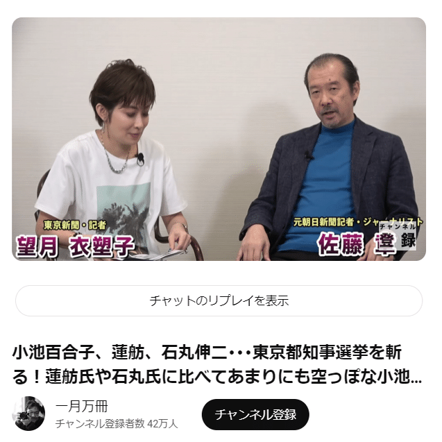 あと「一月万冊」ってチャンネルの動画では、望月衣塑子さんもでてきて「百合子はダメ、石丸か蓮舫」っていってたり」