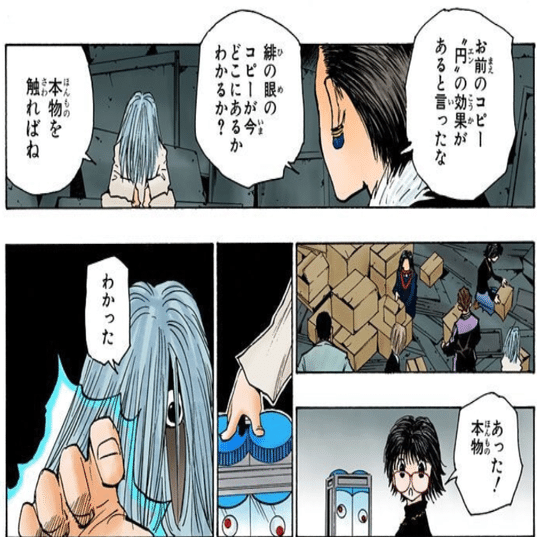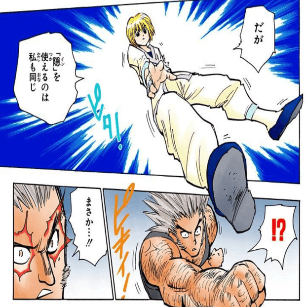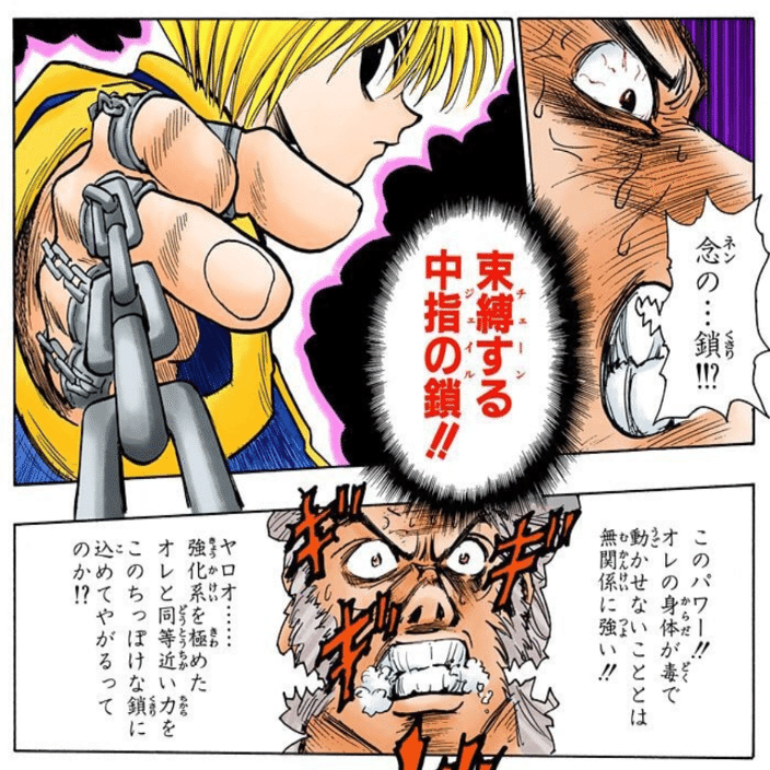 このときに絶にさせられてると気づく前に落とされたから、「威力がめちゃくちゃ高い鎖」=「練で防がないといけない」という、「絶にさせる」に気づかせる前に締め上げたのも最高に運が良かった?