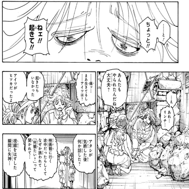 「クラピカとフェイタンが相討ちとなり、クラピカが血まみれで転がってる横で、ヒソカが幻影旅団を抜けて、クロロと一騎打ちが始まる。しかし、クロロは依然として優位であり、おそらく残り6人の団員が助けに来てヒソカも死ぬ」