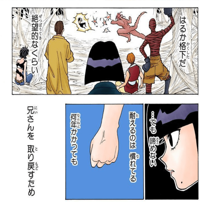 しかし、アルカが「なんでも願いを無限に叶えられる(おそらく間違いなのだが)」と知った途端、キルアの人格を壊してでも欲しくなる。つまり、キルアよりもアルカのほうが「欲しいもの」になったから、キルアは不要になった。これは何もおかしいことではない。これまでは、「キルア」が一番欲しかった。「アルカ」が「キルア」より欲しくなったから、キルアは壊しても良い。なんというわがままさだろうか。