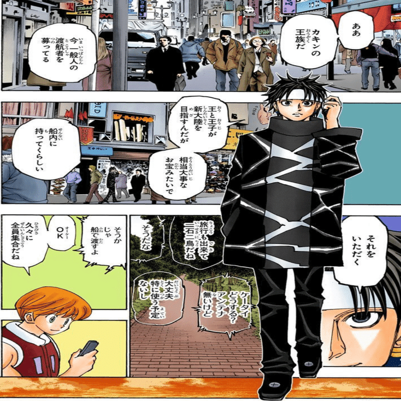 ここで「クロロが電話をかけて話してる相手は、クモ入団が決まったイルミ」で、シャルナークが話してる相手は声帯模写で「クロロの声を出しているヒソカ」ではないか?(イルミの声の可能性もある)