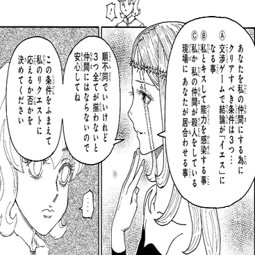「ブラックホエール号の設計に介入し、特殊戒厳令という、カキン王族の権限による捜査であっても見つからないだろう場所を作れるほどの”力”を持っていること。天空闘技場のフロアマスターになったりするような超能力も有していること。必ず”近い将来”カキンの滅亡、つまりブラックホエール号を沈めるレベルの戦争を仕掛けようとしていること」