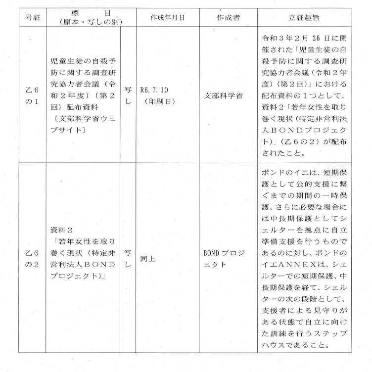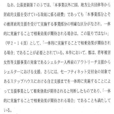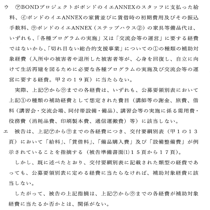 (裁判所)支援が違法かどうかを検討するに当たり、支援の対象となる事業・経費が何かを見ることになる。被告は、「ボンドのイエ」と「ボンドのイエANNEX」がどのような事業で、このような理由で先進的であるから、交付金による補助の対象になる、ということについて、証拠に基づいて主張できないか。被告がこの主張をした後に、原告に反論をしてもらう。