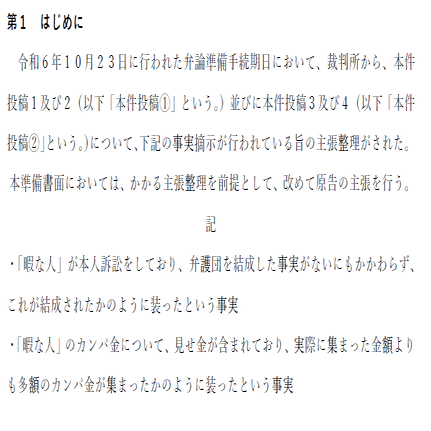 な「弁護団を結成してないのに結成したと装ったという事実摘示と、見せ金をしてカンパ金をかさまししたという事実摘示ですか、だいぶスッキリしましたね」