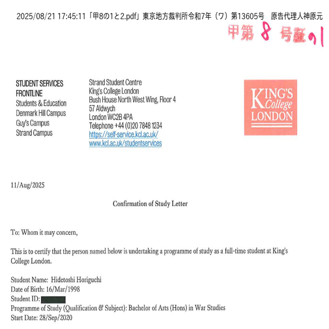 8/21 堀口英利原告の神原弁護士がついた裁判で2通目の在学証明書が提出され、To:Whom it may concernだった