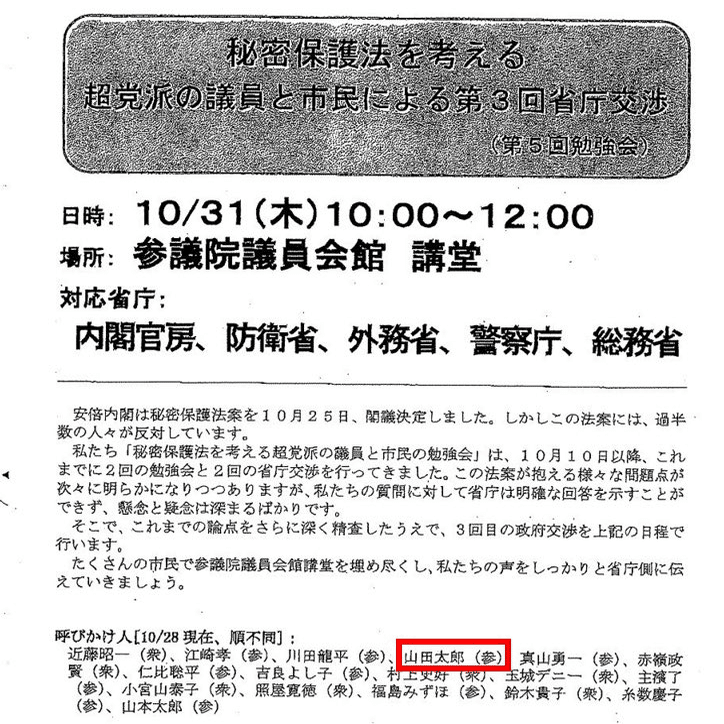 川田龍平、吉良よし子、玉城デニー、福島みずほ、山本太郎と秘密保護法反対議員連合の呼びかけ人になってたり