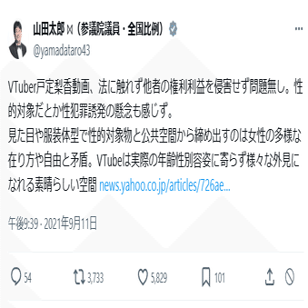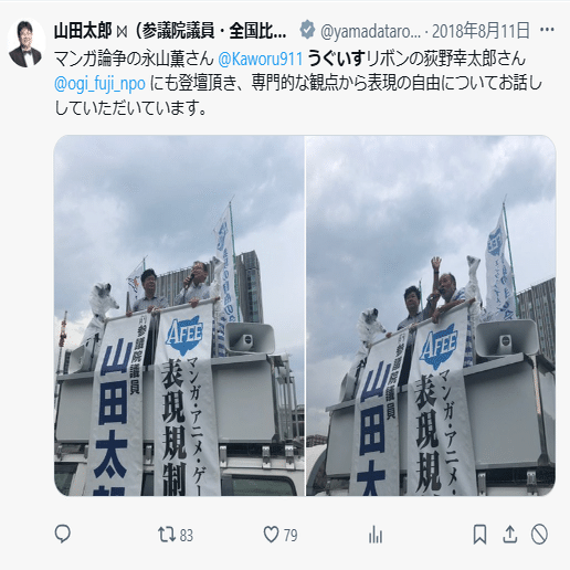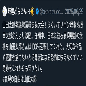 山田太郎は表現の自由をうたってるけど、宇崎ちゃんや温泉むすめや数々の炎上って、ノーコメントか、「戸定梨香?法的に問題無いと思うし素晴らしいですね」みたいな何の意味もないコメントを出すかしかしなかった。炎上と戦うことはしなかった。俺はみたことない。