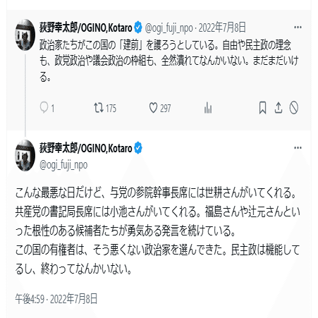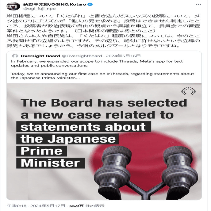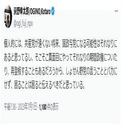 そして荻野幸太郎が守りたい表現の自由とは、岸田総理に「くたばれ」と言う程度の表現が許される自由のようだ