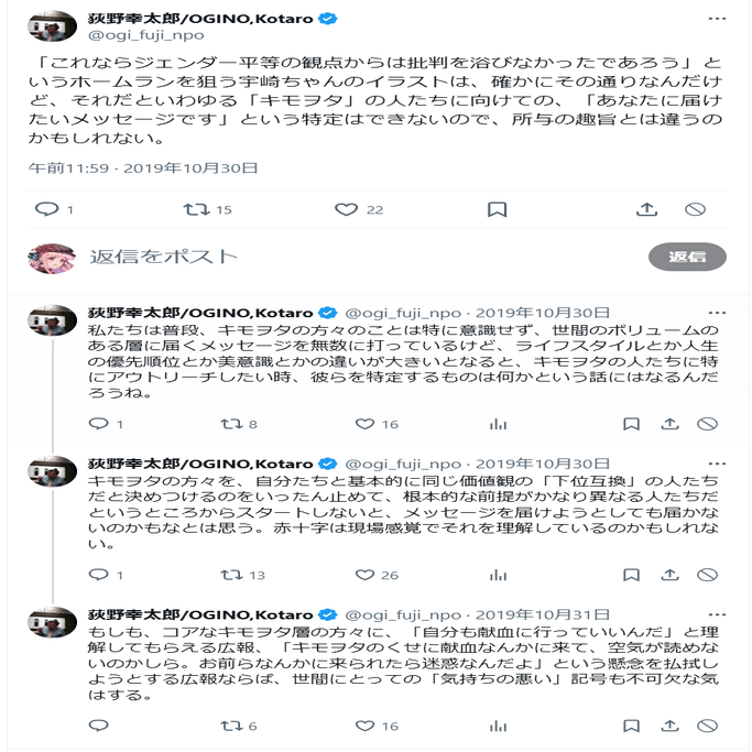 なるほど、宇崎ちゃんのポスターのターゲットは「キモオタ」と定義し、「キモオタ」を狙い撃ちにしてるのが宇崎ちゃんポスターだってさ。荻野幸太郎さんによれば。