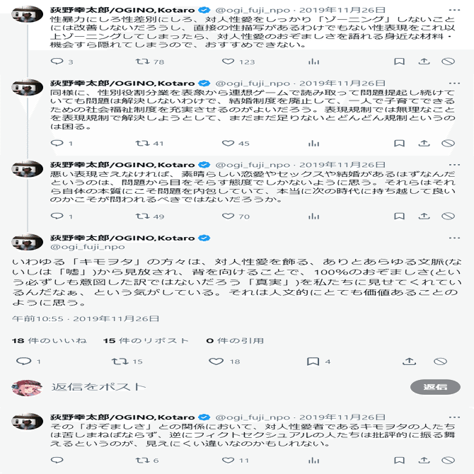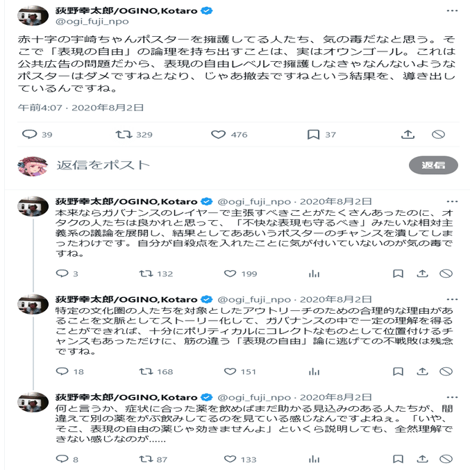 荻野幸太郎さんによれば、キモオタを釣った「宇崎ちゃん事件」は、表現の自由で守る範囲じゃないってさ。そして撤去しろだってさ。