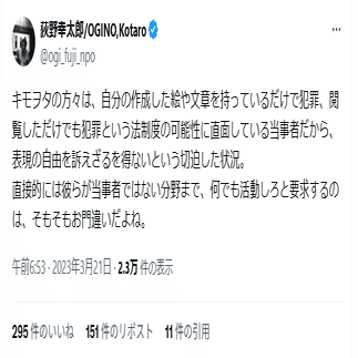 キモヲタが自分たちの好きな萌え絵が持ってるだけで犯罪にならないよう表現の自由様にすがってるんだってさ。で、荻野幸太郎や山田太郎たち表現の自由界隈に、何でも活動しろって要求するのはお門違いだってさ