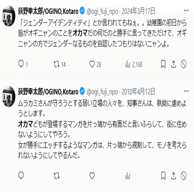 荻野幸太郎が2010年の有害図書指定事件で守りたかったのは「オカマどもが登場する」漫画らしいので、BLかゲイ漫画だろうね