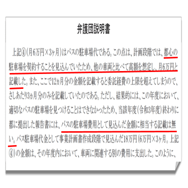 これに対して弁護団は、計画書ではバスの駐車場として予定していたが、結果的に他の関連費に流用したとし、流用が既成事実化したとしている。