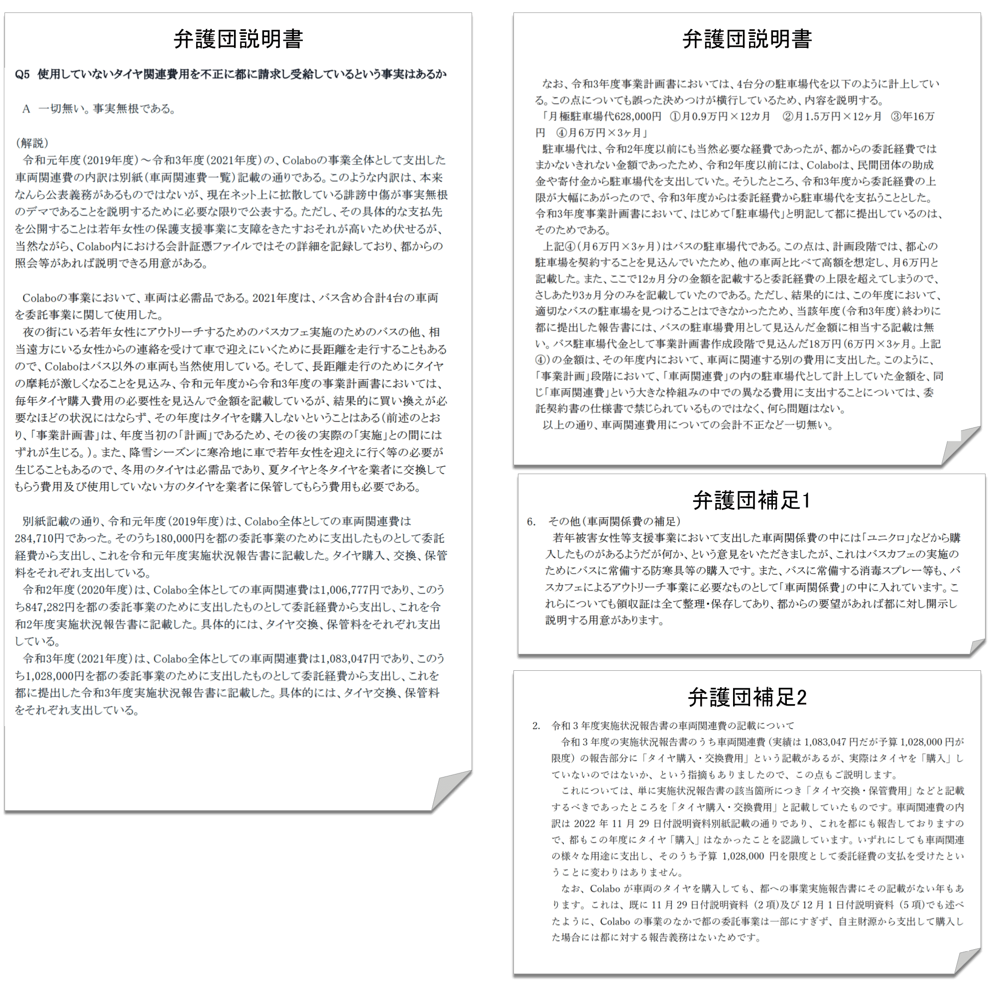 「費目間流用」及び「事業計画が実施報告を拘束しない」とする弁護団説明書は東京都の合意が証明されてないだけでなく、傍証により東京都が承諾していない可能性が高い。以下に令和3年度の実施計画書及び状況報告書の車両関連費を示す。計画書には6万/月×3ヶ月の駐車場内訳がある。