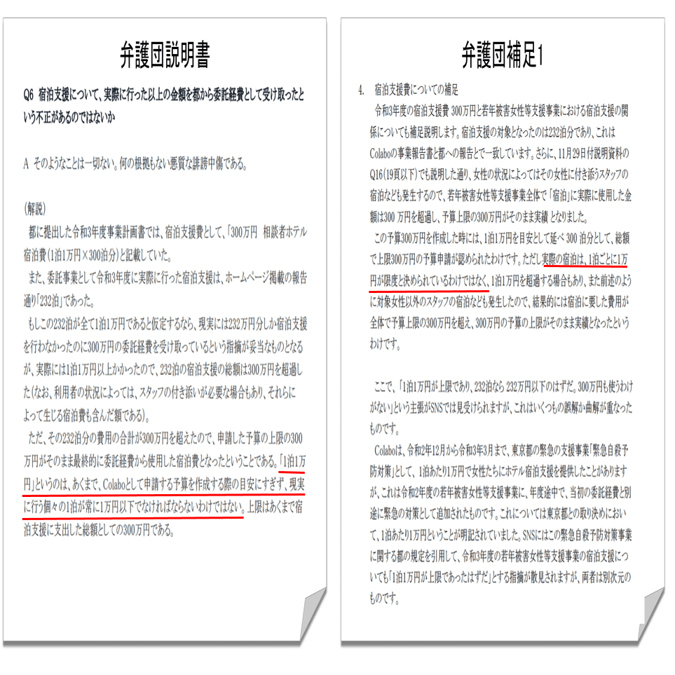 弁護団の「使わなかった」との説明と矛盾すると共に、東京都担当者は「計画書に沿った支出」を証言しており、流用も想定していない。そして担当者の言を信じれば確認先のcolaboも同じ認識ということになる。令和3年駐車場以外についても「計画書」に沿ったやり取りを暇空氏と東京都とで実施した可能性も高く、録音もしているであろう。バイアスのかかってない暇空氏と東京都のやりとり(一部音声付き)と証拠の裏付けがなくcolabo弁護のバイアスのかかっている弁護団説明書のどちらの真実性が高いであろうか。私はバイアスがない状態の東京都担当の言に真実性があると考える。現在は東京都担当者と弁護団で口裏合わせがなされている恐れがある。