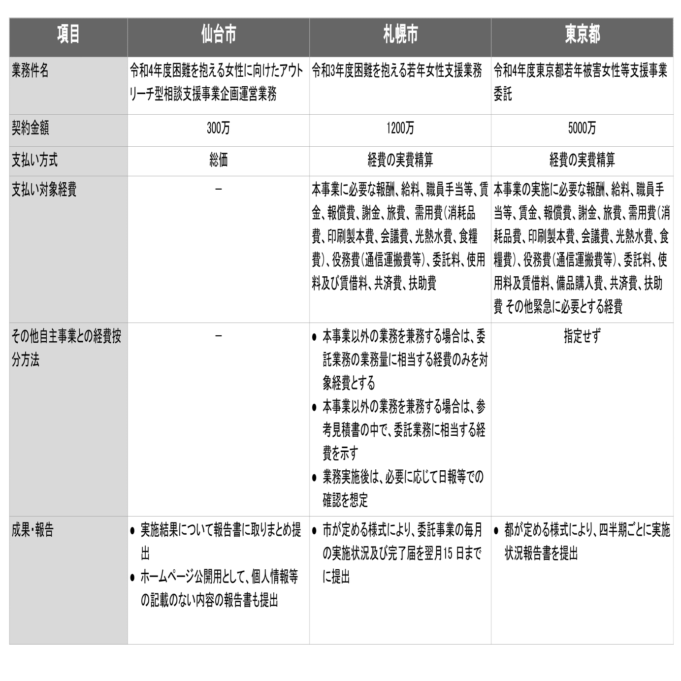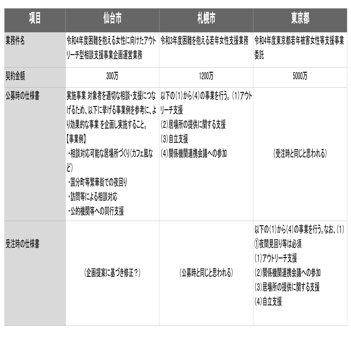 若年被害女性等支援事業の委託契約については、東京都以外に札幌市及び仙台市が実施しており、3者の契約形態を比較検証し、東京都に提言を行う。なお、仙台市と札幌市の発注については以下のサイト情報を参考とした。