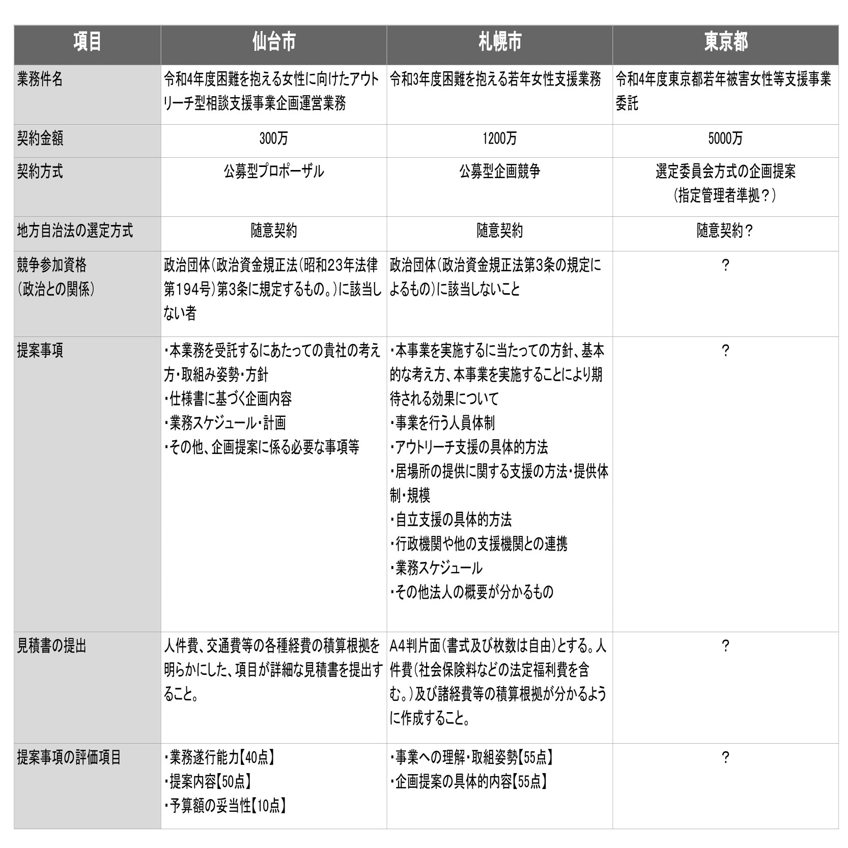 東京都、仙台市、札幌市の選定方法を以下に比較する。なお、東京都については選定プロセスが公開されておらず、詳細は不明である。札幌市、仙台市ともに見積書を提出させている。恐らく、団体を選定後に見積書を再度提出させ、設計書*2及び予定価格*3を算定しているものと思われる。