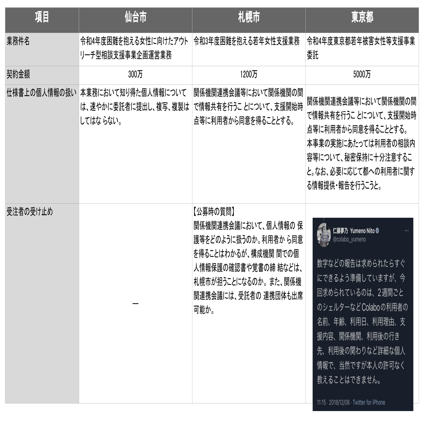 東京都及び札幌市について、関係機関の協議に個人情報を扱えるように予め利用者に同意を得ることになっている。東京都及び札幌市に対する利用者の許可を得ることはその前提となっていると考えられる。当時の仕様書は未見だが仁藤氏は平成30年に利用者の個人情報を許可なく教えないとしており、現在もこの運用をしていた場合は仕様書を満足しない可能性がある。札幌市の受注者の質問は札幌市と利用者の個人情報が共有されることを前提として、関係機関における個人情報の扱いを確認したものである。