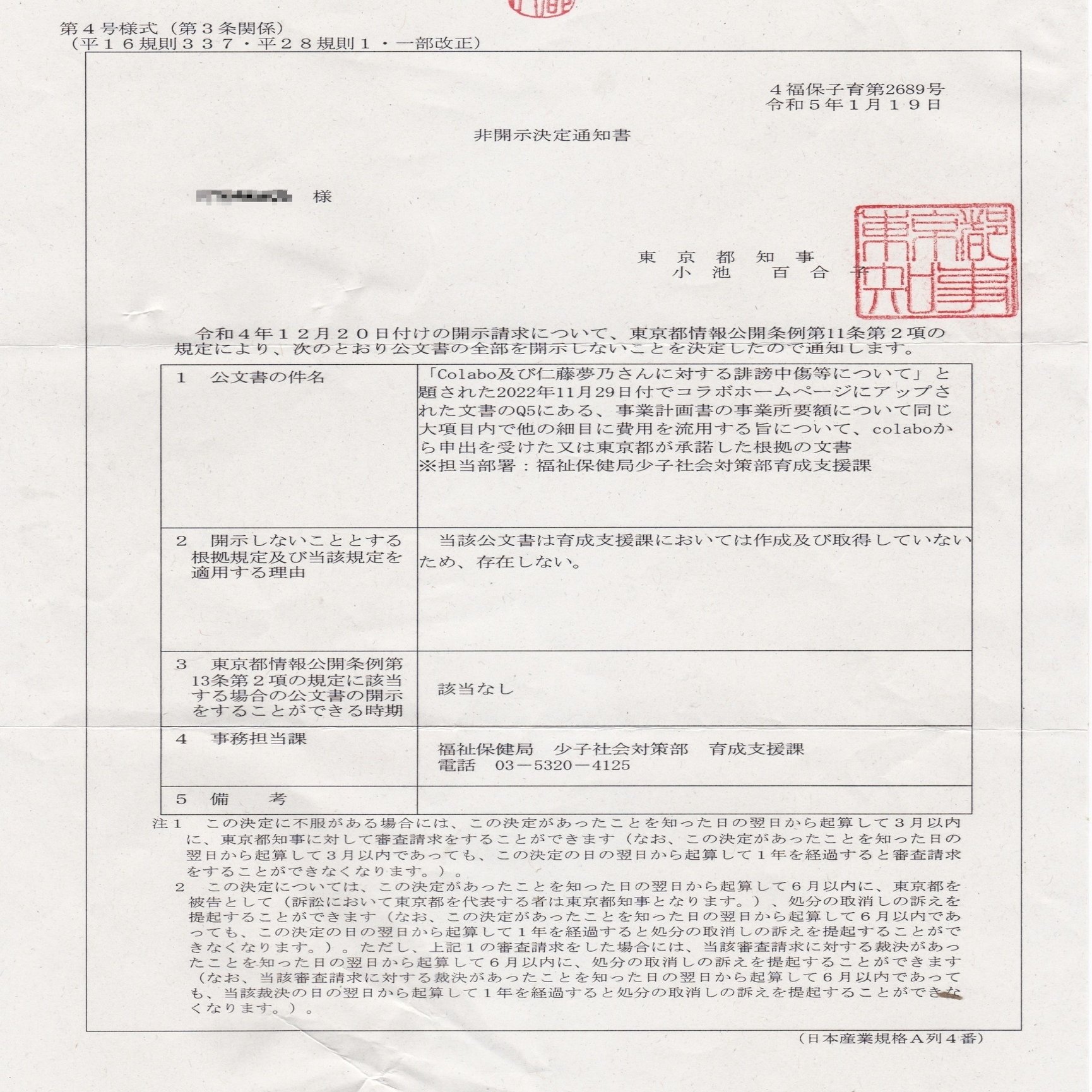 このため、東京都に事業計画書細目の流用の承諾について開示請求を行ったところ、該当文書はないとの回答を得た。