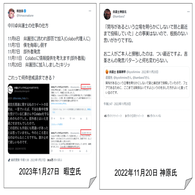 colabo弁護団の中川及び神原両弁護士は、中川弁護士の弁護団加入時期と関連ツイートについて、時間軸の整合がとれない釈明をしているようである。