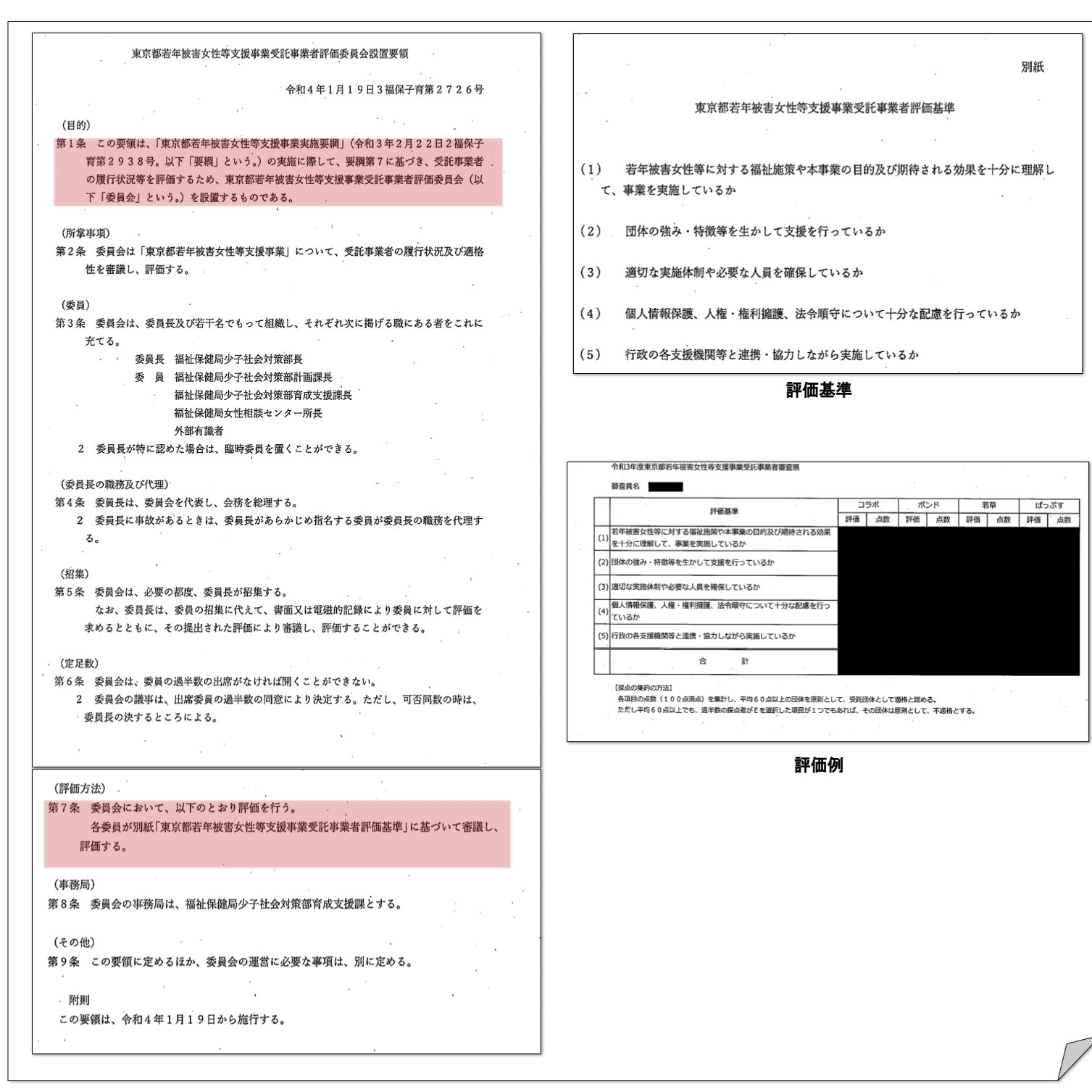 しかしながら、事業評価委員会は実施中の事業評価が目的であり、次年度業務の適格性評価を目的としない。実際の評価表も実施中の事業に対する項目しかなく、信頼性等「団体」としての評価も行っていない。これを次年度契約の事業者決定に使用するのは公法上の契約としても目的外使用である。