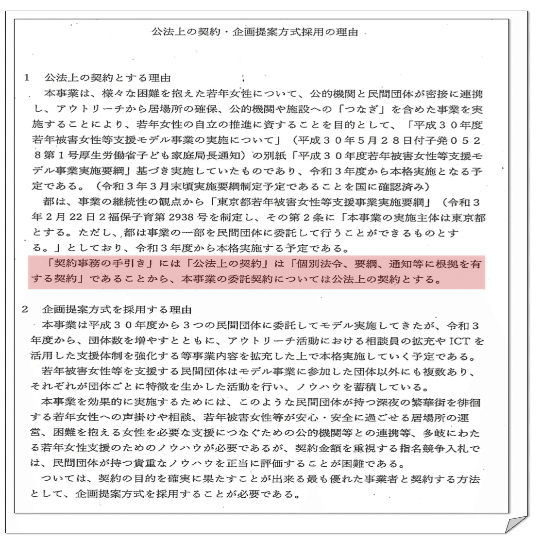 地方自治法では、契約の相手方の選定は入札(総合評価含む)による競争か随意契約しかない。しかし、東京都では「公法上の契約」であれば、自治法の規定には拘束されないものとして運用しているようである。東京都の「契約事務の手引」では、要領や通知を根拠とする契約を公法上の契約としており、厚労省の支援事業の実施要綱をもって公法上の契約としているようである。