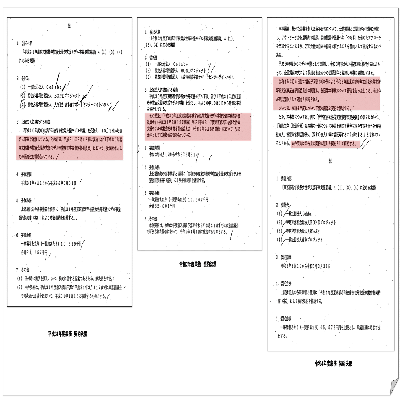 暇空氏から提供頂いた開示資料からH31,R2,R4年度の東京都若年被害女性支援事業は入札、企画競争又は随意契約理由もなく委託先と契約していることが疑われた。公共調達において考えられないことであり、最初の記事では「妄想」としていた。